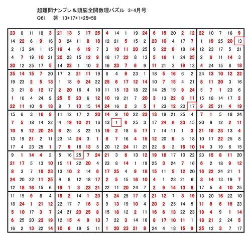 今回は9x9マスが5個並ぶ問題が3問です。 Q35 答 25 プレゼント 商品券5千円分 2名 Q37 答 13 プレゼント 横浜ロイヤルパークホテル バラエティセット 2名 Q39 答 23 プレゼント 図書カード5千円 2名
